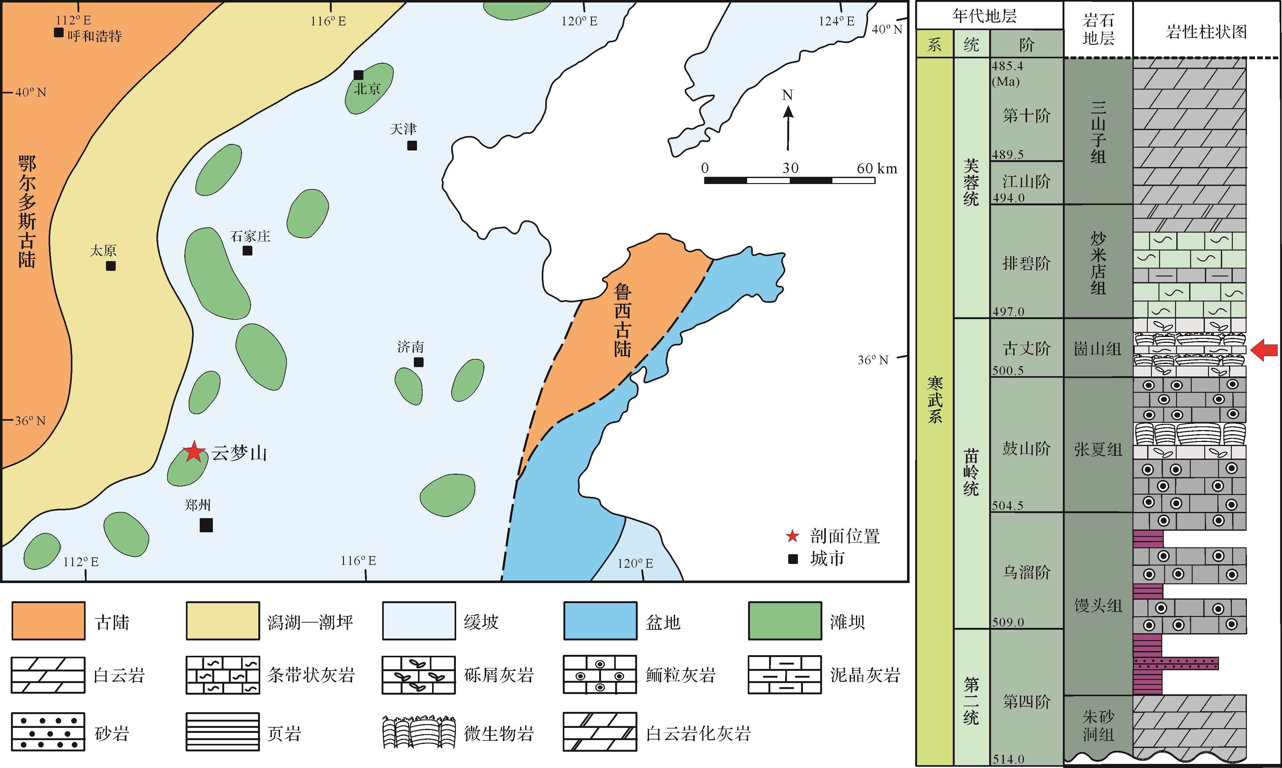 华北地区在寒武纪为一个位于低纬度地区的独立地块,在新元古代至寒武纪早期“大不整合”事件之后开始接受沉积[37]。受寒武纪第二世晚期大规模海侵事件的影响,华北板块从周缘向内部逐渐被海水覆盖,形成广阔的陆表海;板块整体表现为西高东低、南高北低的古地理格局,且以潮坪和潟湖环境为主[38]。苗岭世时,除鄂尔多斯古陆和鲁西古陆外,其他地区大部分被海水覆盖,从陆地向深水方向依次发育了潟湖、潮坪、浅滩、缓坡和陆棚环境,以清水碳酸盐沉积为主(图1)。至芙蓉世时,华北板块受海退影响,碳酸盐沉积物不断向较深水区进积;浅水环境主要为开阔台地,古陆周缘则以局限台地为主[38]。   Figure 1. Palaeogeography of the North China Block in the Cambrian Miaolingian, and the lithostratigraphic column of the study area 华北寒武系出露良好,从下至上依次为辛集组、朱砂洞组、馒头组、张夏组、崮山组、炒米店组,及部分三山子组(穿时),一些地区寒武系底部缺失辛集组[39]。研究区位于河南省鹤壁市淇县与新乡市卫辉交界的云梦山景区内,寒武系朱砂洞组至炒米店组发育完整,出露情况良好(图1)。本次研究关注的崮山组属苗岭统古丈阶,厚度近30 m,底部以三叶虫Blackwelderia开始出现为标志[39⁃40],岩性主要为灰色薄—中层条带状灰岩、砾屑(竹叶状)灰岩、泥晶灰(白云)岩、鲕粒灰岩,以及中—厚层微生物岩。崮山组下伏地层为张夏组,岩性以灰色中—厚层鲕粒灰岩为主,含少量微生物岩和砾屑灰岩;上覆地层为炒米店组,岩性主要为中—厚层细晶白云岩、瘤状白云岩,以及条带灰岩、含生物遗迹灰岩和生物扰动灰(白云)岩[39⁃41]。