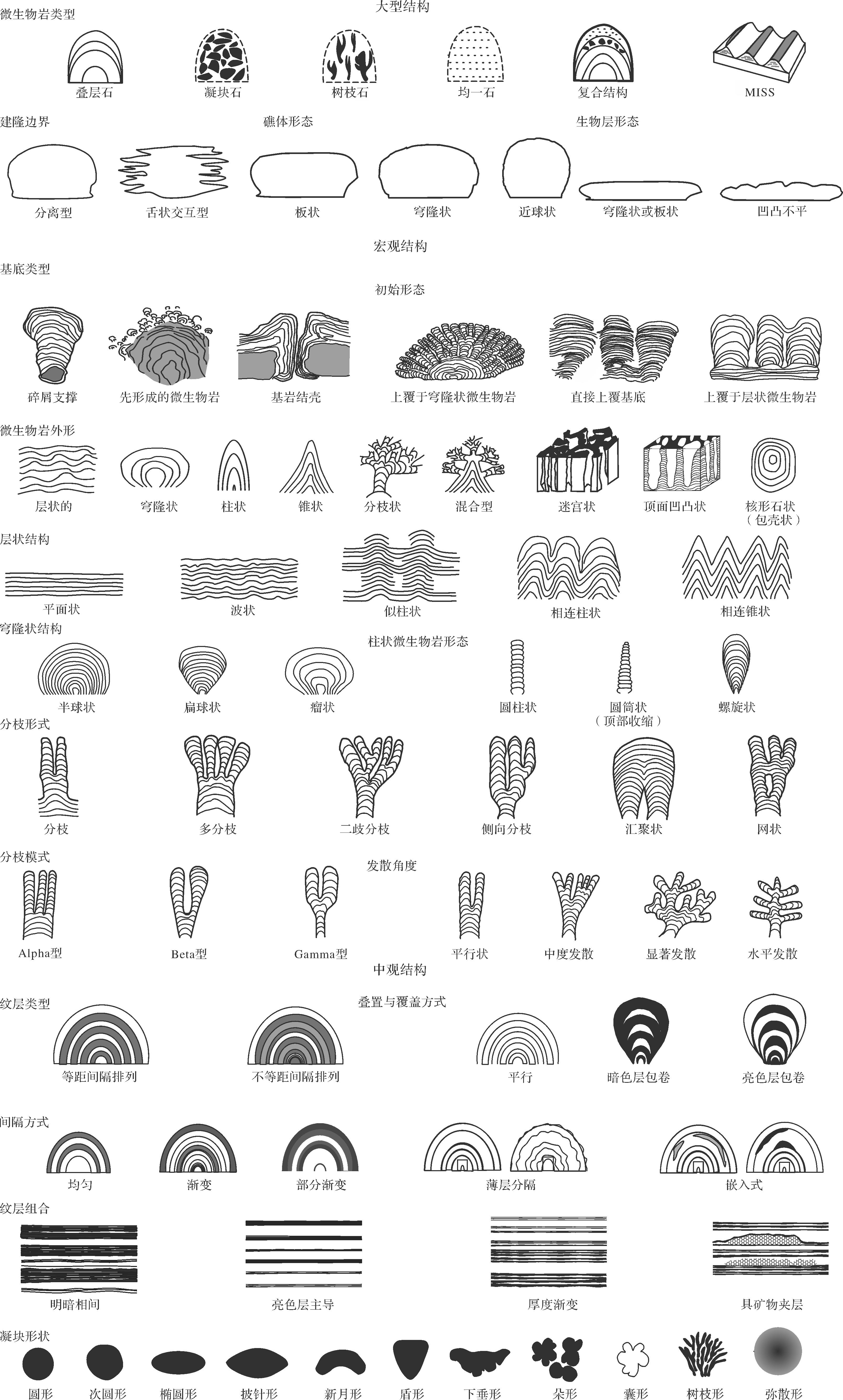 目前对微生物碳酸盐生产工厂的研究较为薄弱,还没有广为接受的研究方法和实施方案供参考。研究尝试从工厂生产定量化评价的角度出发,主要通过系统的野外观察和统计学工作,结合光面特征对典型微生物岩类型、内部结构和生长过程进行精细刻画,对工厂发育的环境因素和自身建造过程进行分析。对微生物岩形貌特征观察采用广泛接受的Shapiro[42]方案,主要对它的宏观结构、大型结构和中观结构进行区分。对微生物岩结构特征描述采用Grey et al.[17]方案(图2)。野外采用网格法定量统计相关参数,步骤包括:(1)对每个微生物岩露头垂向上按横纵坐标每10 cm间隔标记并拍摄大量细节照片,完成详细观察描述;(2)室内将照片整理后利用CorelDRAW软件绘制长、宽均为1 cm的密集网格线;(3)根据野外描述记录统计网格线内不同微生物组构宽度、高度、类型占比以及其他参与工厂建造的颗粒类型和分布情况等参数,辅以少量光面和薄片进行微观特征验证。   Figure 2. Grey and Awramik's Microbialite classification scheme (selected from reference [17])