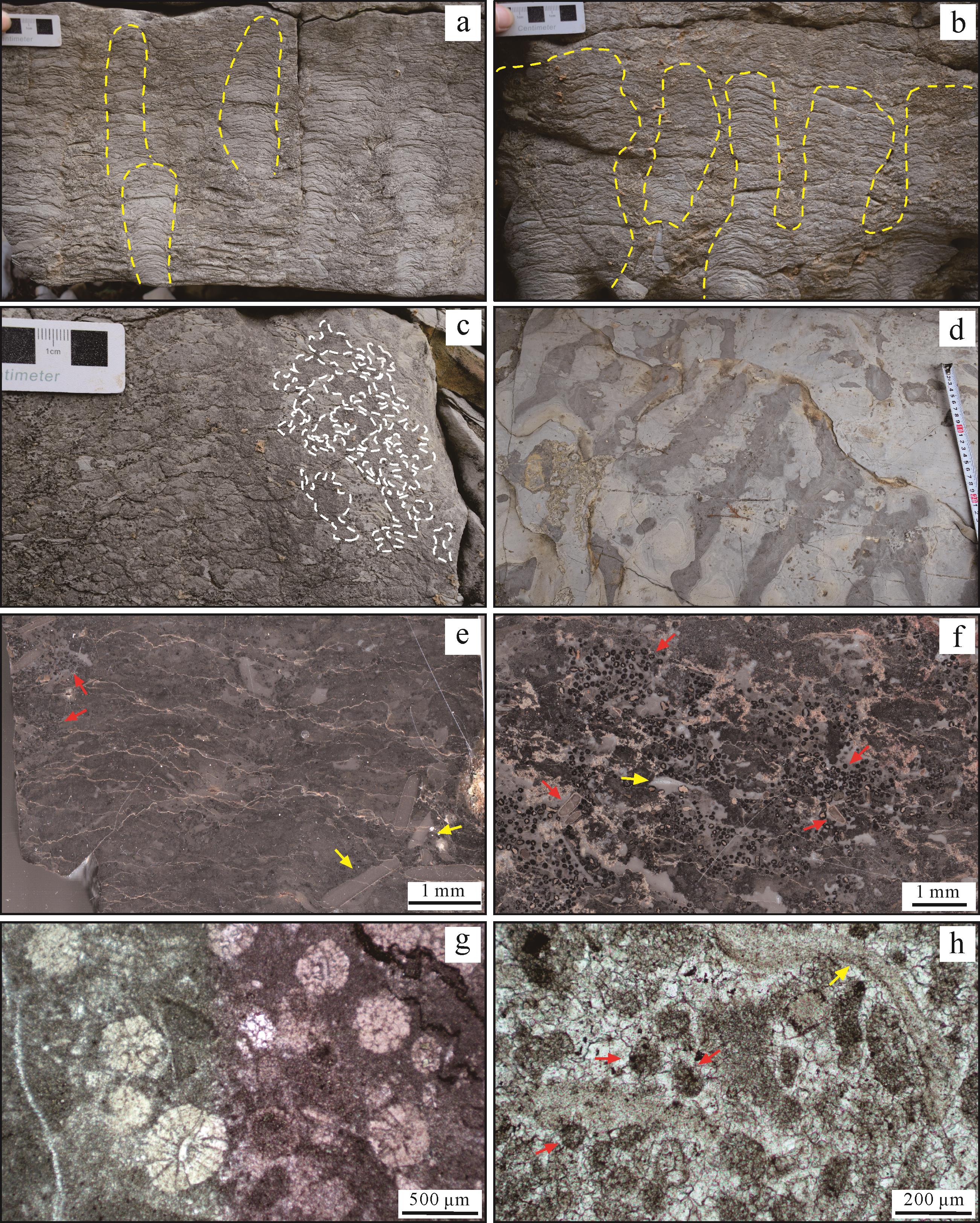 研究区崮山组中记录的微生物碳酸盐生产工厂的构成具有特殊性。工厂构成的基本单元包括叠层石、凝块石、树枝石、均一石和MISS构造(图3)。这些单元既可以单独产出(图3a~f),也可在空间上相互叠置形成共生关系(图4),保存的整体形态有近球状(图4a~c)、大型板状(图4d~f)和穹窿状(图4g~i)等类型。叠层石产出类型多样,单体形态包括柱状、穹窿状和层状等,这些单体常构成复合结构(图4)。层状结构叠层石内部一般具波状起伏的纹层(图4a,b);穹窿状叠层石少见,主要为近球状(图4a);柱状叠层石常见,以条带状泥晶灰岩为基底(图4a,d),部分以层状和穹窿状叠层石为基底,柱体以直立状、分枝状、汇聚状和交织状等较为常见(图3a,b、图4a,b,d,e)。凝块石主要为小型穹窿状或层状形式产出(图3c、图4a),以次圆形、朵形凝块为主(图4e,h)。树枝石主要发育于大型穹窿状结构的内部,凝块呈辐射的树枝状结构(图4g,h)。均一石形成于大型穹窿状结构的顶部,呈薄层状,内部成分均匀,与下伏微生物组构紧密接触而与上覆岩层存在截然界面(图4a,b),这与泥晶灰岩自然层存在明显差别(图4d,e)。MISS构造主要发育于大型穹窿状微生物岩层顶面,保存在波痕的波脊处,波峰和波谷均较为圆滑,波痕高度不超过3 cm,具典型流水波痕特点(图3d)。其他参与者还包括鲕粒、内碎屑、灰泥,以及少量生物碎屑(图3e~h)。鲕粒主要保存在微生物层状结构和凝块结构内(图3e),或者结构之间的孔洞(图3f,g),显示出异地埋藏特征。球粒粒径主要介于50~80 μm,磨圆极好,内部为泥晶化颗粒(图3h)。内碎屑颗粒丰富,主要保存在工厂基本单元周围,分选较差,磨圆较好(图3e、图4a)。工厂发育的基底主要为被侵蚀的条带状泥晶灰岩,向上突出具隆起正地形(图4);盖层主要为具典型超覆特征的鲕粒泥粒—颗粒灰岩(图4a),或者薄层泥晶灰岩(图4d,g)。