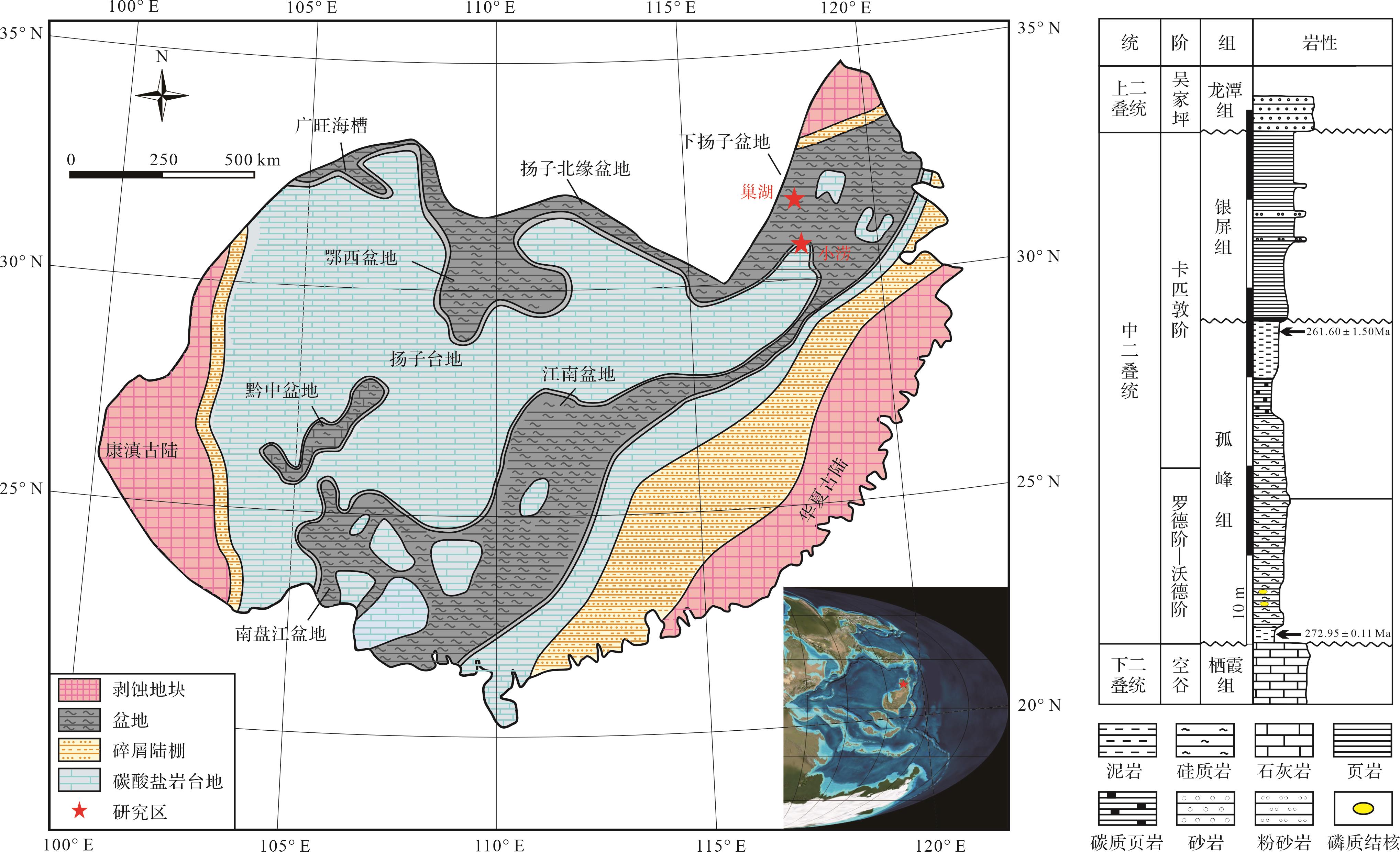 中二叠世时期,华南地块是古特提斯洋东部的一个大型热带孤立地台(图1)[18],台地内部主要发育浅滩碳酸盐岩浅海环境以及台内较深水硅质岩盆地环境。下扬子地区整体处于华南地块的北部,位于江绍断裂带和郯庐断裂带之间,西北与华北地块相邻,东南与华夏板块相连,东北部延伸至黄海,以西为中上扬子地块。该区自显生宙以来经历了多个构造阶段和多旋回的盆地生成、发展、改造、叠加过程,形成了极富个性的构造格局[23]。中二叠世期间,该区坳陷形成下扬子盆地,沉积了深水相的孤峰组黑色硅质岩[24]。Wu et al.[2]和Zhang et al. [25]分别对巢湖地区孤峰组底部和顶部地层进行了锆石U-Pb定年实验,获得了较为精确的年龄,较好地限定了孤峰组的沉积时间,即孤峰组底部为中二叠世与早二叠世的界线,而孤峰组顶部与银屏组的界线为卡匹敦晚期。