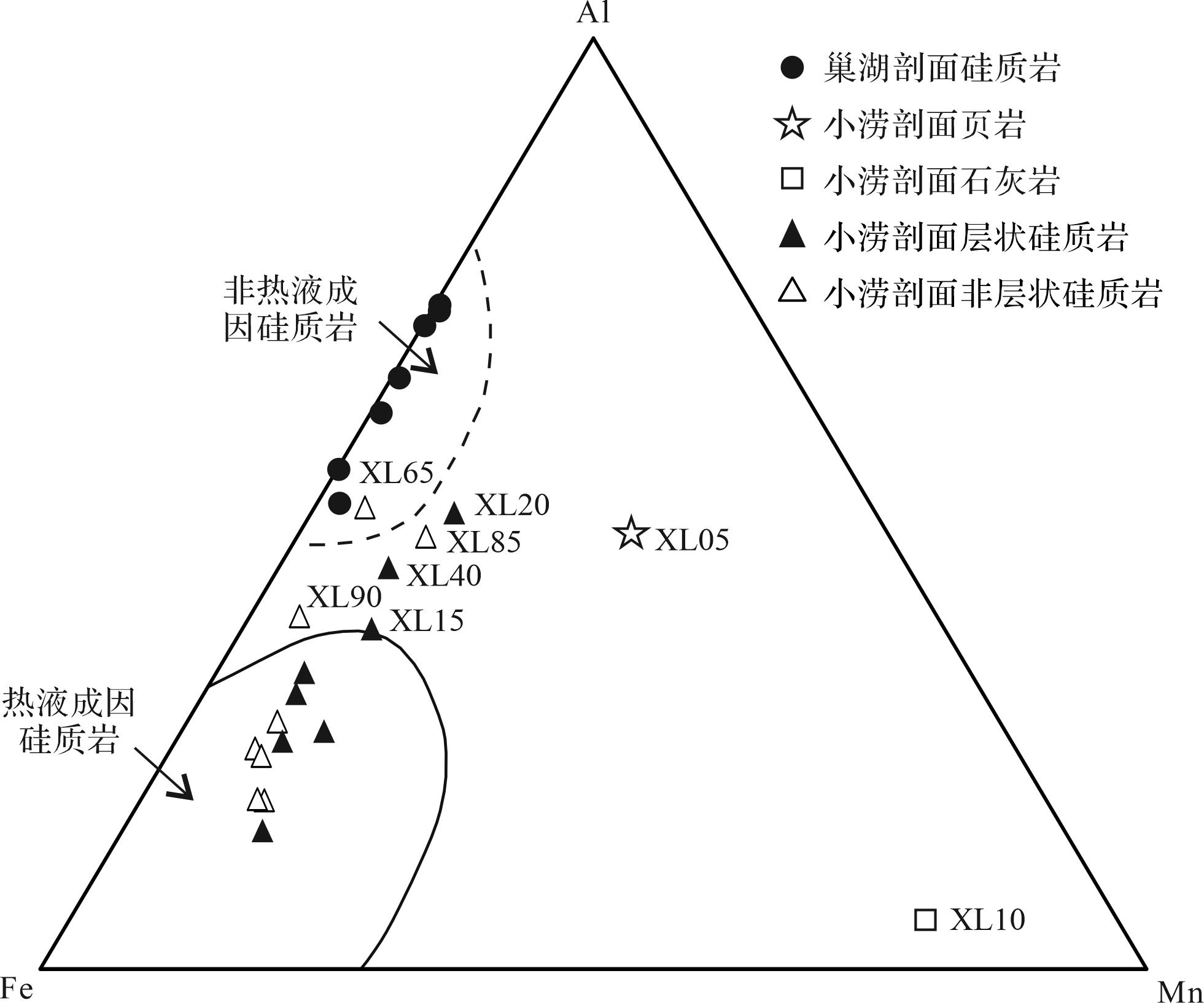 Al和Ti共同出现在铝硅酸盐矿物相中,是指示陆源输入的良好指标;而铁一般富集于洋中脊富金属沉积物,是指示热液活动输入的优质参数[27]。Adachiet al.[28]通过统计现代海洋热液系统和正常生物成因的硅质岩制作了Al-Fe-Mn三角图版,以区分热液和非热液成因的硅质岩。海相沉积物中Al/(Al+Fe+Mn)比值也被用于测量热液活动对沉积物沉积的贡献[29]。他们认为东太平洋洋脊热液的沉淀物中Al/(Al+Fe+Mn)比值低至0.01,而半远洋硅质岩沉积物中该比值为0.60。热液的影响越强,Al/(Al+Fe+Mn)比值越低,热液的影响越弱,该比值则越高[28]。安徽巢湖剖面和小涝剖面的孤峰组硅质岩的Al-Fe-Mn三角图表明,巢湖剖面孤峰组硅质岩为非热液成因硅质岩,而小涝剖面孤峰组硅质岩大部分样品均为热液成因(图3)。这些结论与沉积物岩相特征吻合,巢湖剖面孤峰组硅质岩中富含硅质海绵骨针以及放射虫(图2a~c),说明硅质岩为生物成因,而非热液成因;小涝剖面硅质岩为青灰色层状和非层状,几乎不含硅质生物,以微晶石英为主要矿物(图2d~h),这从侧面上也支持了热液成因,而非生物成因。