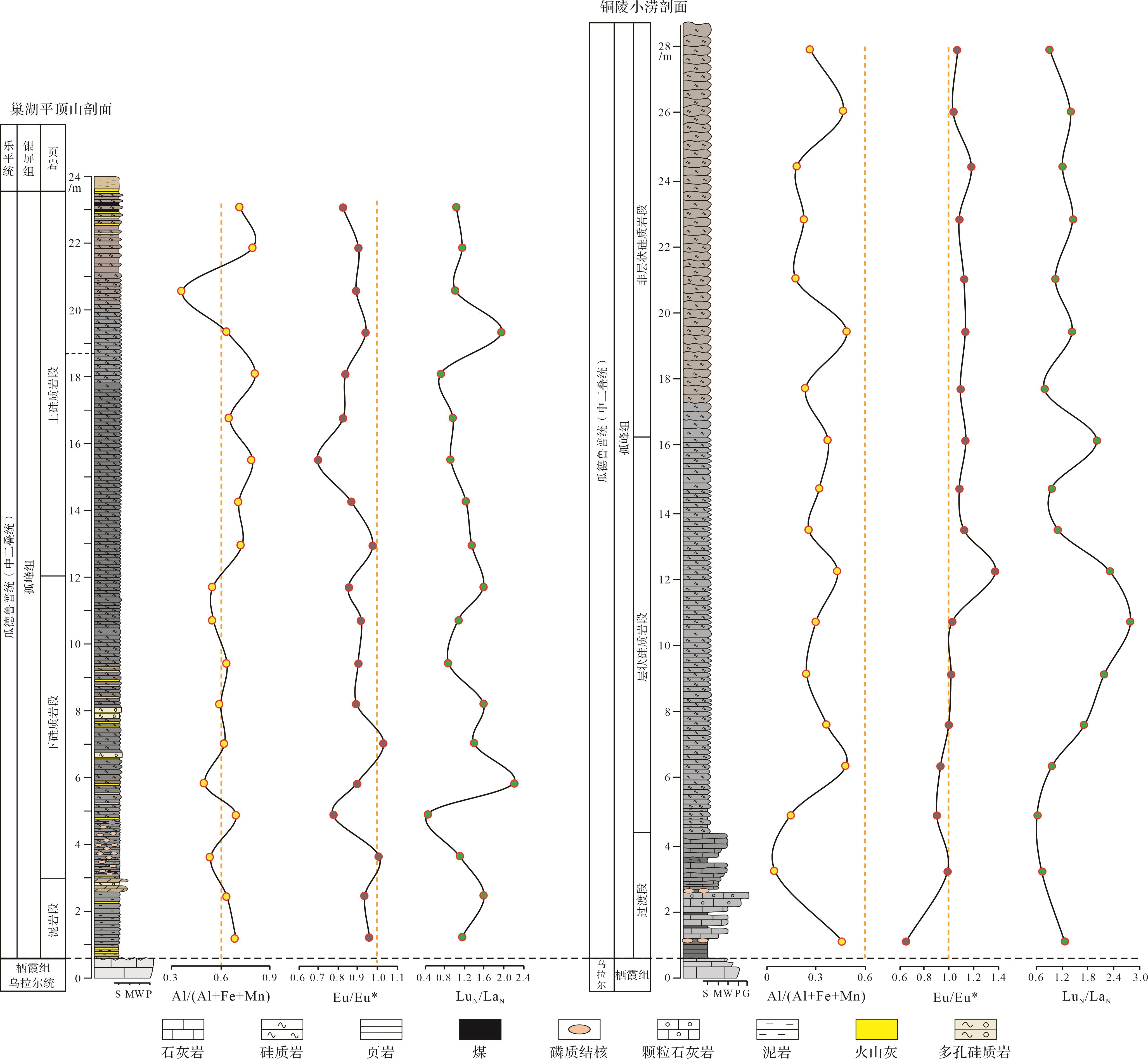 在正常的海水中,由于重稀土比轻稀土具有更强的无机络合作用而表现为更稳定的流体化学行为[35⁃36],因此轻稀土比重稀土更容易从海水中被清除,从而在海水的稀土元素配分模式图中显示轻稀土亏损的特征[30]。洋盆的热液流体具有轻稀土富集的特征[33],洋中脊热液将海水中大量的轻稀土吸收导致其周围海水具有轻稀土亏损的特征。因此,在洋中脊的硅质岩中,由于硅质岩主要吸附海水或者被热液改造过的海水的稀土元素,硅质岩稀土元素配分模式显示明显的轻稀土亏损特征,此时LuN/LaN比值高达3[37⁃38]。随着远离洋中脊,沉积物中LuN/LaN比值由1.55逐渐下降至0.87,至正常的洋盆则下降为0.37[34]。而在开放的大陆边缘海环境中,轻稀土被带出海水而显示出轻稀土亏损的特征,此时沉积物中LuN/LaN比值又升高至1.10左右[34]。巢湖剖面孤峰组硅质岩中LuN/LaN比值主要分布在1.2左右,仅在下部硅质岩段中出现部分高LuN/LaN比值的样品(表3),同时稀土元素配分曲线同样表明没有存在明显的轻稀土亏损的特征(图4,5)。然而,小涝剖面的孤峰组硅质岩中LuN/LaN比值普遍较高,最高接近3.0,平均值达2.3(表6),存在明显的轻稀土亏损特征(图4,6),这也说明小涝剖面孤峰组硅质岩很可能为热液成因。