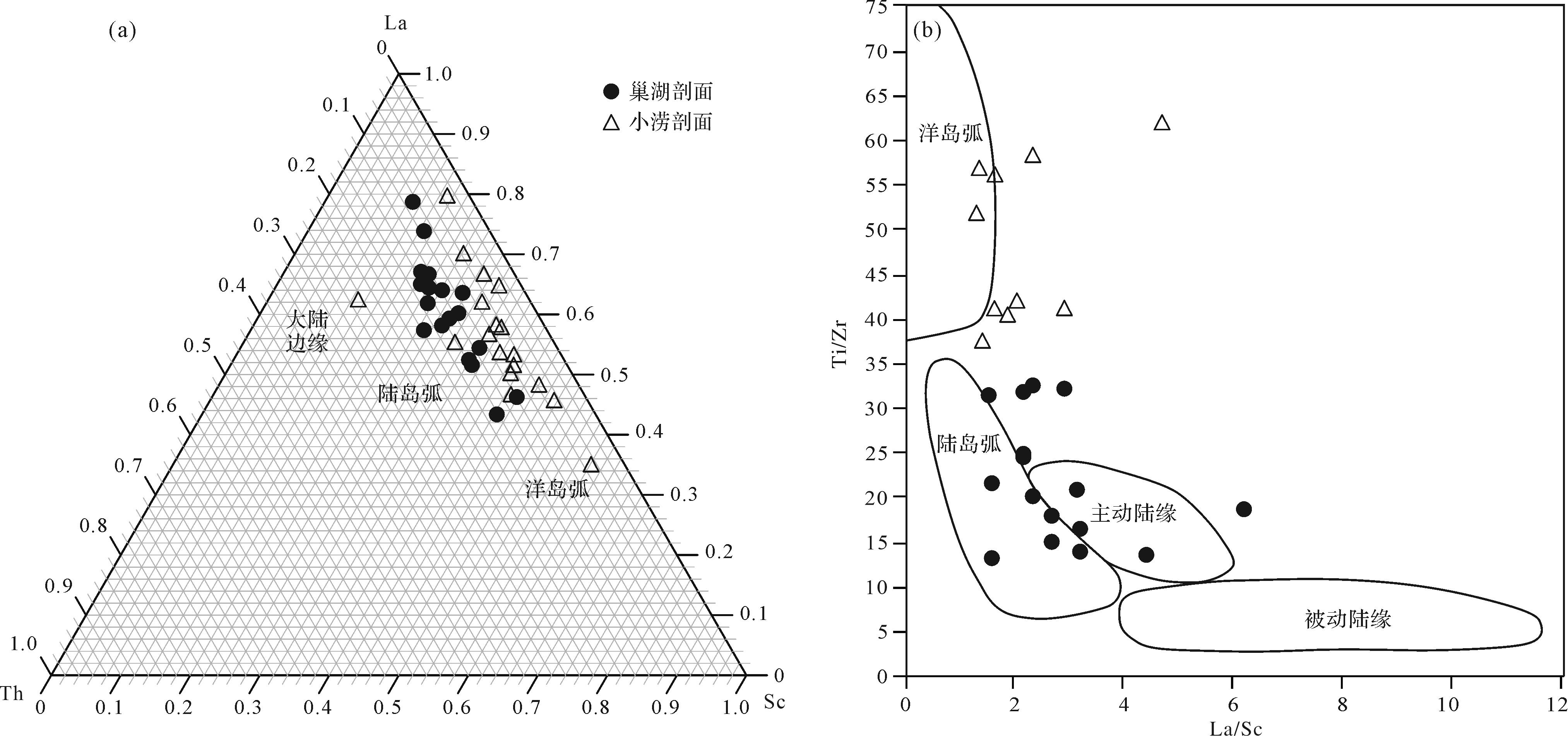 上述热液硅质岩的形成可能与下扬子区特定的构造背景有关。某些惰性微量元素能指示物源构造背景,例如元素La、Zr、Ce、Nd、Y、Hf、Nb、Ti、Sc、Th由于在沉积过程中迁移度较低以及海水居留时间较短,可以用于约束物源和构造背景[39]。在风化和搬运过程中,这些元素被定量地搬运到碎屑沉积岩中,因而能指示母源的信号[40]。La-Th-Sc三角图能区分不同的构造背景。洋岛弧样品往往展示较高的Sc含量以及较低的La/Sc比值(平均值为0.55±0.2),大陆边缘样品往往展示较高的La含量以及较高的La/Sc比值(La/Sc=4),而陆岛弧样品则处于上述两种环境的中间,表现为中等的La/Sc比值(平均值为0.8±0.3)[41]。该图能区分古生代洋和陆岛弧环境,但难于区分主动大陆边缘和被动大陆边缘。La/Sc与Ti/Zr的交会图则可以区分大陆边缘的构造背景。洋岛弧样品以Ti/Zr比值大于40以及La/Sc比值大于1为特征;陆岛弧样品一般以Ti/Zr比值为10~35以及La/Sc比值为1~3为特征;主动大陆边缘样品以较高的La/Sc比值(3~6)与陆岛弧样品相区分;被动大陆边缘样品以Ti/Zr比值小于10以及较高的La/Sc比值(3~9)与其他构造背景的样品相区分[41]。巢湖剖面和小涝剖面孤峰组硅质岩均不属于被动大陆边缘构造属性,前者反映陆岛弧和主动大陆边缘的构造属性(图7a),而后者反映洋岛弧构造背景(图7b)。主动大陆边缘和洋岛弧构造环境中热液活动较为常见,这从构造上解释了铜陵小涝孤峰组热液硅质岩存在的成因,以及巢湖地区孤峰组硅质岩部分样品保留微弱的热液活动信号的原因。