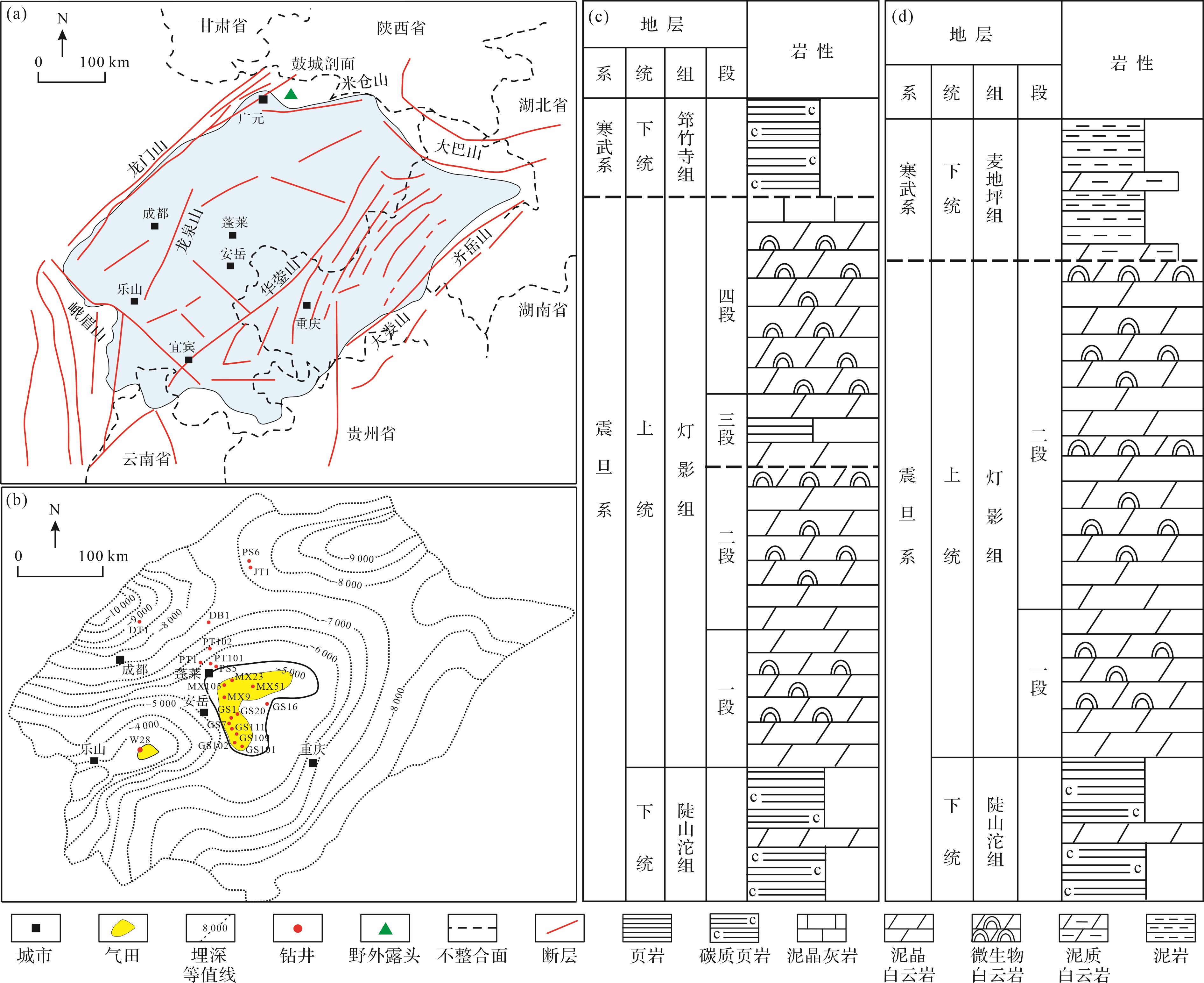 研究区位于四川盆地中部,包括安岳、蓬莱两个地区(图1a)[13]。本区发育加里东期形成的古隆起构造[21⁃22]。在多期构造改造过程中,古隆起整体继承发育(图1b),最终在喜山期后定型[1]。基于藻类含量和沉积构造类型,区内震旦系灯影组可被划分为四段,其中,灯二段和灯四段以叠层石、凝块石等微生物白云岩为主,灯一段以泥晶白云岩为主,灯三段以黑色泥页岩为主[2]。晚震旦世的桐湾期抬升运动,导致灯二段和灯四段顶部经历了剥蚀和广泛的岩溶作用,形成了大规模不整合面[23⁃24]。不同于安岳地区(图1c),蓬莱地区大部分缺失灯三段、灯四段,灯二段直接与上覆寒武系不整合接触(图1d)。在此背景下,灯二段、灯四段顶部形成了分布广泛的古岩溶改造成因藻类丘滩储层。近年来针对储层内沥青的定量研究表明,寒武系麦地坪组、筇竹寺组泥页岩均可以作为灯影组成藏的主力烃源岩[7]。