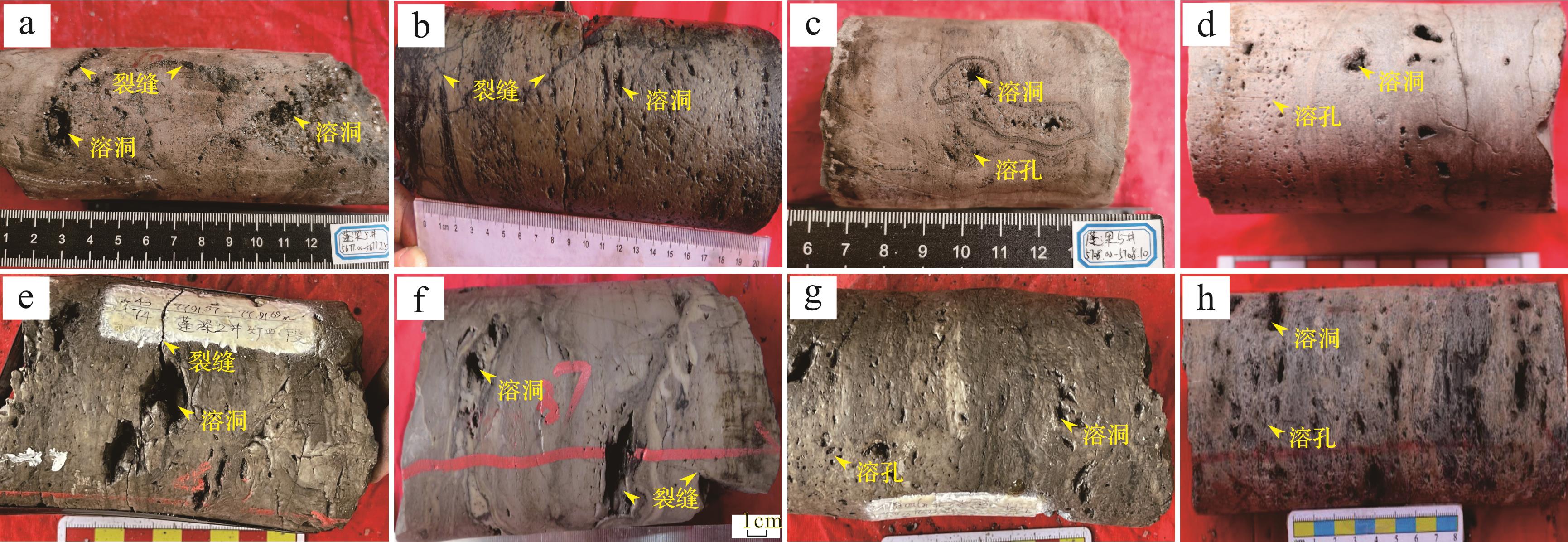 灯四段缝洞型储层在岩心上呈浅灰、褐灰色,原岩为凝块石白云岩和叠层石白云岩(图2e,f),全直径岩心孔隙度介于2.22%~5.27%,平均为3.58%,全直径岩心渗透率介于0.33×10-3~8.96×10-3 μm2,平均为0.63×10-3 μm2。测井响应特征为:扩径明显,声波时差明显增大,高中子,电阻率明显降低且侵入特征明显。孔洞型储层为浅灰、褐灰色,原岩为砂屑白云岩、凝块石白云岩(图2g,h),全直径岩心孔隙度介于1.42%~4.51%,平均为2.92%,全直径岩心渗透率介于0.17×10-3~4.87×10-3 μm2,平均为0.32×10-3 μm2。常规测井响应特征为:扩径不明显,电阻率明显降低,侵入特征不明显,密度降低。