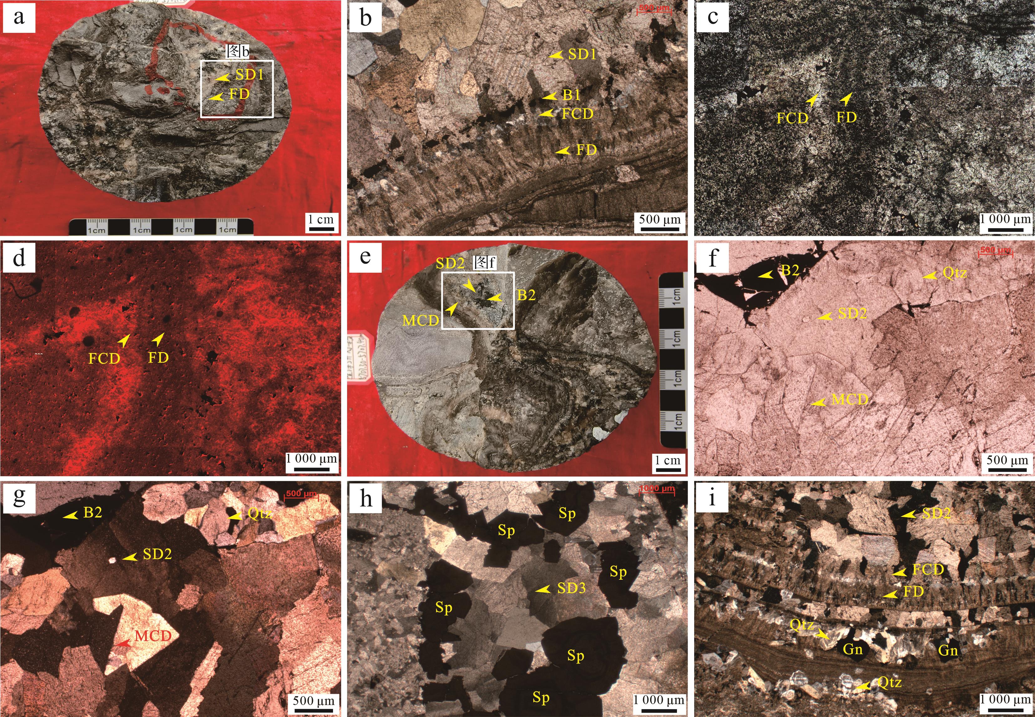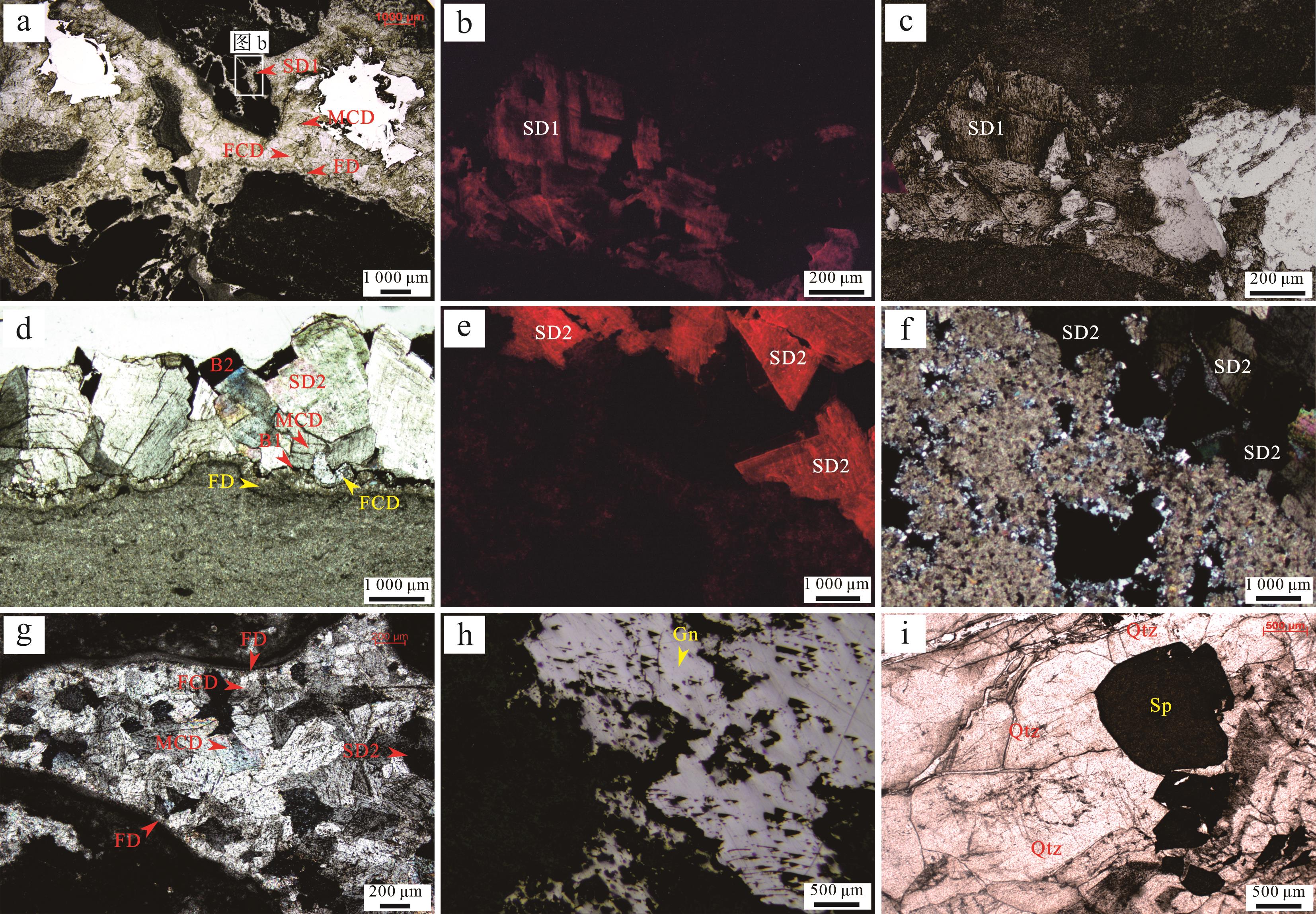 灯二段储层中最多可识别出9期成岩矿物(图3,4),灯四段储层中最多可识别出8期成岩矿物(表1)。第1期矿物为纤状白云石(FD)(图3a,b),俗称葡萄花边构造或葡萄状环边胶结(图3c,d),这一类白云石形成于同生海底阶段。前人研究提出纤状白云石(FD)的出现印证了灯影组沉积期海水Mg/Ca比演化规律,属于灯二段中—上部溶洞、溶缝内“白云石海”事件的结晶产物,能直接反映埃迪卡拉末期的海水化学性质,这一类白云石胶结物形成时间早,多具有单向延长的特征,被认为是文石类矿物被早期白云石化改造的结果[27]。同时,由于海平面频繁震荡,可出现同生期暴露前后的多期纤状白云石。相比灯四段(图4a),该类矿物在灯二段中发育时间长、发育期次多,在海底胶结阶段、准同生期大气淡水成岩阶段以及表生成岩阶段均有发育。第2期矿物为细晶白云石(FCD),这类白云石的自形程度高,镜下观察中晶体更为透亮,阴极射线下呈光亮发光特征,与纤状白云石、粒状白云石等较为暗淡、不发光的特征对比明显[1]。第1期沥青(B1,又称沥青膜或沥青线),志留纪末期伴随地层持续埋深,裂陷槽内烃源岩在志留纪末期达到生烃门限,开始第一期原油充注。储渗空间边缘的细晶白云石表面出现第一期油气充注形成的沥青膜(第1期沥青),这一现象在蓬莱和安岳地区均可观察到[28⁃29]。矿物占位关系表明,多期纤状白云石(FD)与细晶白云石(FCD)形成时间早于早期古油藏(B1)形成时期,第1期鞍状白云石(SD1)(图4b,c)、中晶白云石(MCD)(图3e,f)、第2期鞍状白云石(SD2)形成晚于第1期沥青(图4d~g)[13],但早于第2期沥青(B2)(图3g)。在第3期鞍状白云石(SD3)与方铅矿、闪锌矿共生后(图3h,i、图4h),形成了最晚一期成岩矿物为石英(Qtz)(图3i、图4i)。