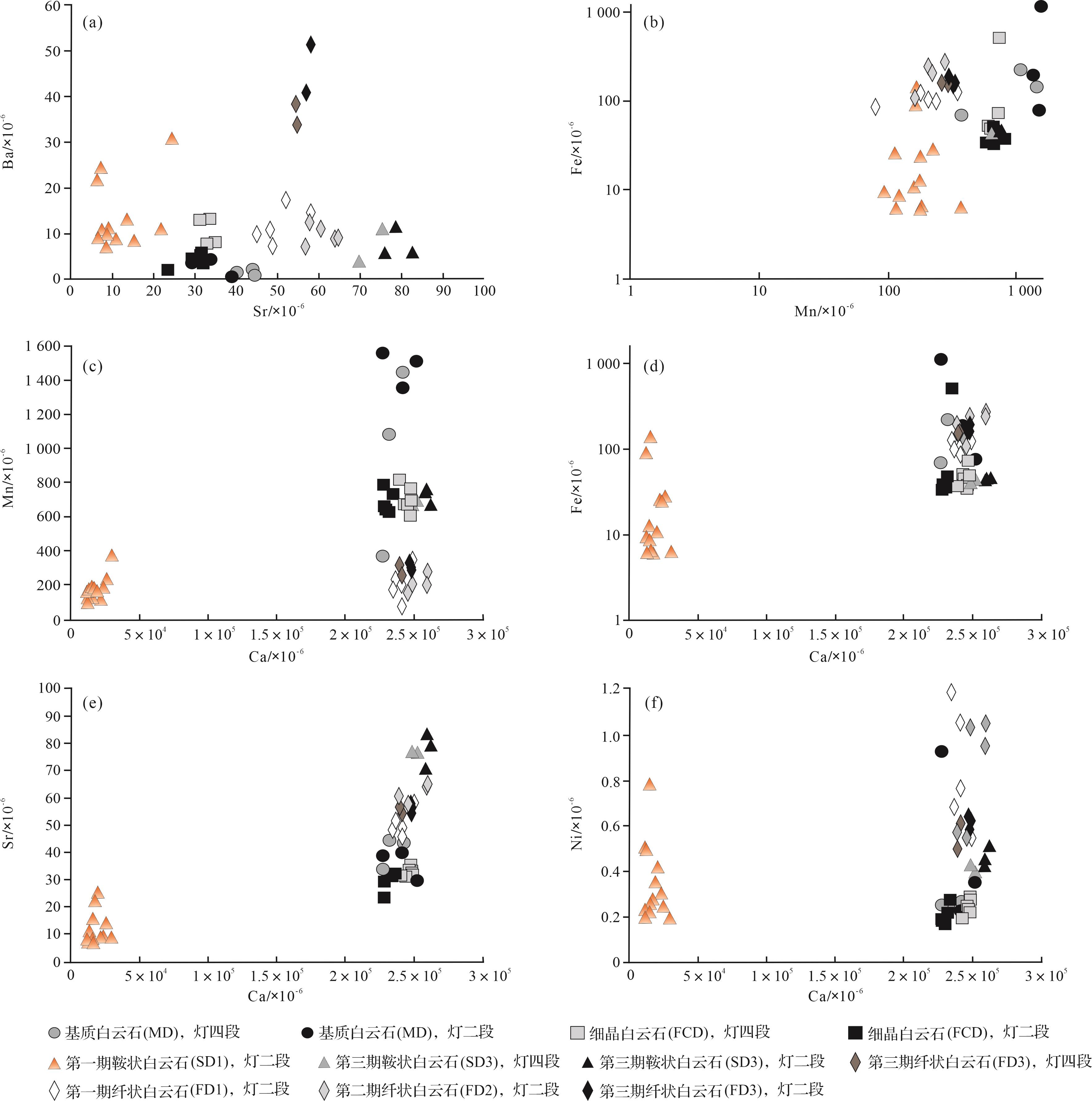 灯二段与灯四段不同期次的纤状白云石样品具有相似的微量元素Sr、Fe、Mn含量(图5c~e),Ba、Ni含量在不同期次中差异明显(图5a,f)。与第1期鞍状白云石的各类元素含量相比,第3期鞍状白云石的每种元素含量均明显更高,并且灯四段中第3期鞍状白云石的各项元素富集程度略高于灯二段的同类样品(图5c),并且在微量元素Sr、Ni和Fe含量方面更接近纤状白云石(图5d)。元素丰度的显著差异还表明,第1期鞍状白云石和第3期鞍状白云石具有不同的流体化学性质,明显属于不同阶段的热液流体,推测流体来源、类型明显不同(图5e),后者似乎与海水关系更密切(图5f)。