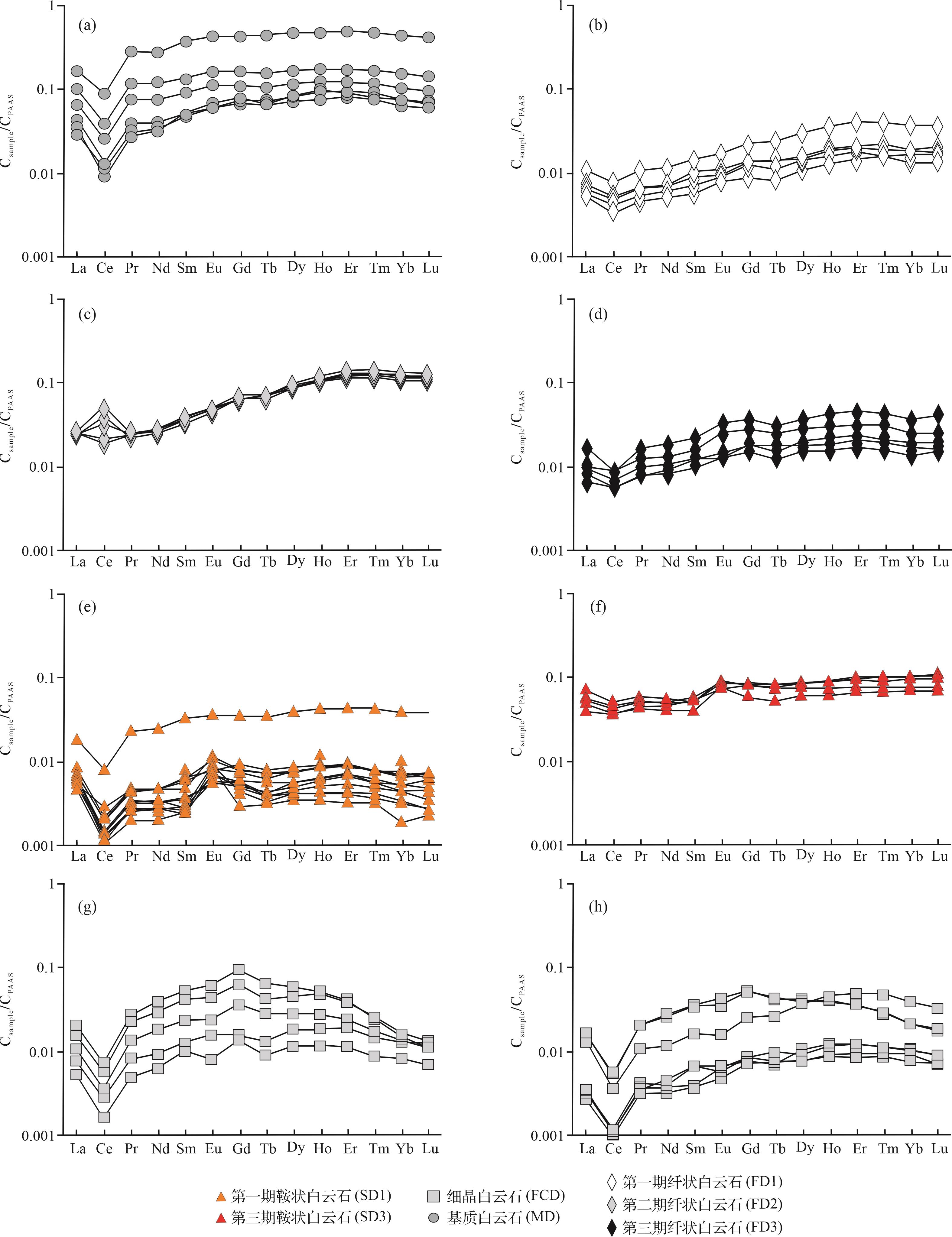 在所有白云石样品中,稀土元素总量普遍偏低,其中基质白云石的稀土元素总量明显较高,介于5.11×10-6~35.49×10-6,平均值高达12.93×10-6。纤状白云石的稀土元素总量变化很大,第1期到第3期纤状白云石的稀土元素总量分别介于0.91×10-6~2.15×10-6、1.43×10-6~2.94×10-6和5.40×10-6~8.55×10-6,稀土元素总量有逐渐升高的趋势。细晶白云石的稀土元素总量介于0.42×10-6~3.27×10-6,平均值为0.86×10-6。第1期鞍状白云石稀土元素总量介于0.48×10-6~4.31×10-6,平均值为1.85×10-6。第3期鞍状白云石稀土元素总量远高于第1期,介于7.86×10-6~11.07×10-6,平均值高达9.22×10-6。