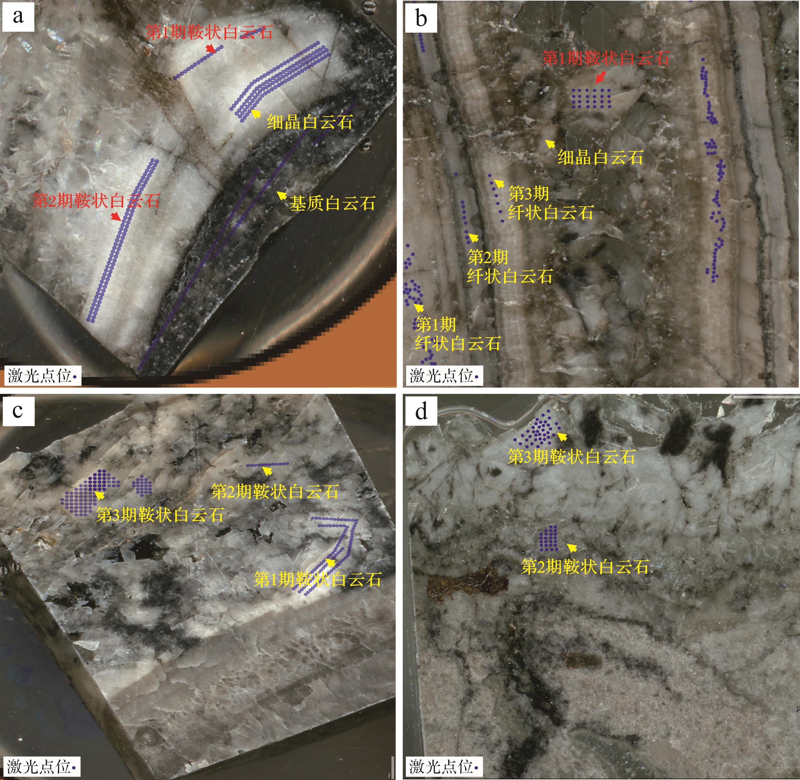 激光原位元素含量测试结果表明(图5),灯二段与灯四段基质白云石样品中主量元素Ca含量的分布范围相近,介于226 860×10-6~251 387×10-6(平均值为236 538×10-6),略高于白云石的标准测量值(约217 071×10-6)[29]。灯二段与灯四段细晶白云石样品中主量元素Ca含量、微量元素Sr、Fe、Mn含量也呈现出相近的富集特征。第1期、第2期、第3期纤状白云石样品中主量元素Ca含量的分布范围分别为234 457×10-6~248 879×10-6、239 275×10-6~247 999×10-6和238 526×10-6~259 396×10-6,平均值分别为240 216×10-6、244 486×10-6和250 064×10-6,均略高于基质白云石。作为热液流体的直接产物,两期鞍状白云石的Ca含量差异明显,第1期鞍状白云石的Ca含量介于11 819×10-6~29 935×10-6,平均值仅为17 907×10-6。而第3期鞍状白云石的主量元素Ca含量介于248 323×10-6~261 980×10-6,平均值高达255 835×10-6。