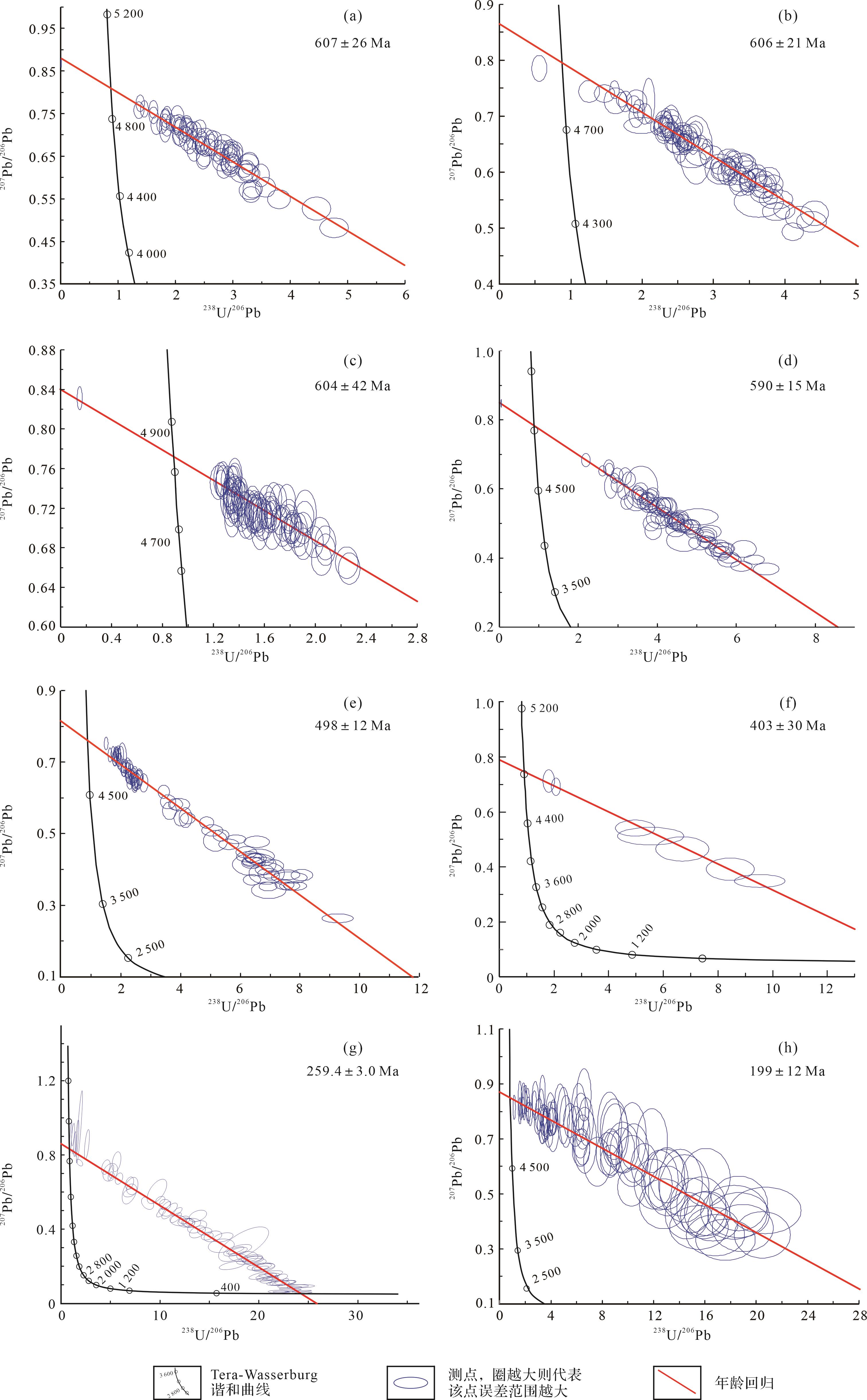 本次研究的14个灯二段岩心样品取自蓬莱地区的5口取心井(PS5井、PS1井、PT1井、PS2井、DB1井),16个灯四段岩心样品来自安岳地区4口取心井(MX105井、GS18井、MX51井、GS109井)和蓬莱地区的2口取心井(PS2井、DB1井)。在储层中成岩矿物类型的鉴定基础上,选取了7个白云石样品进行激光原位U-Pb同位素测年,包括1个基质白云石(MD)样品,3个纤状白云石(FD)样品和3个鞍状白云石(SD)样品。该实验是由成都创源微谱公司的Thermo Scientific quatraple iCap TQ电感耦合等离子体质谱仪(Q-ICP-MS)完成的,每个年龄数据大约需要对白云石矿物打80~115个激光点。具体参数包括直径为150 μm的激光光斑尺寸、3 J/cm2的激光能量和10 Hz的重复频率。白云石样品与NIST-614玻璃标准品和几种基质匹配的实验室工作方解石标准品一起测量,包括PTKD-2和WC-1[3⁃4]。对NIST-614玻璃标准物(包括未知样品)和方解石标准物进行重复测量,以校正207Pb/206Pb分馏和206Pb/238U比值中与仪器相关的漂移[3]。基于激光剥蚀脱气和不同质量分数的U、Pb同位素分析,以238U/206Pb、207Pb/206Pb值分别为横纵坐标、构建Tera-Wasserburg谐和曲线图计算碳酸盐矿物形成年龄,拟合出的不谐和曲线和Tera-Wasserburg反协和曲线下交点位置即为样品形成年龄。独立测年为268.5±2.7 Ma的WC-1方解石标准品和独立测年为153.5±1.9 Ma的PTKD-2方解石标准品也与白云石样品一起测年,作为对照标准品以确保再现性[25], 不同阶段得出的结果在参考值的2%以内。