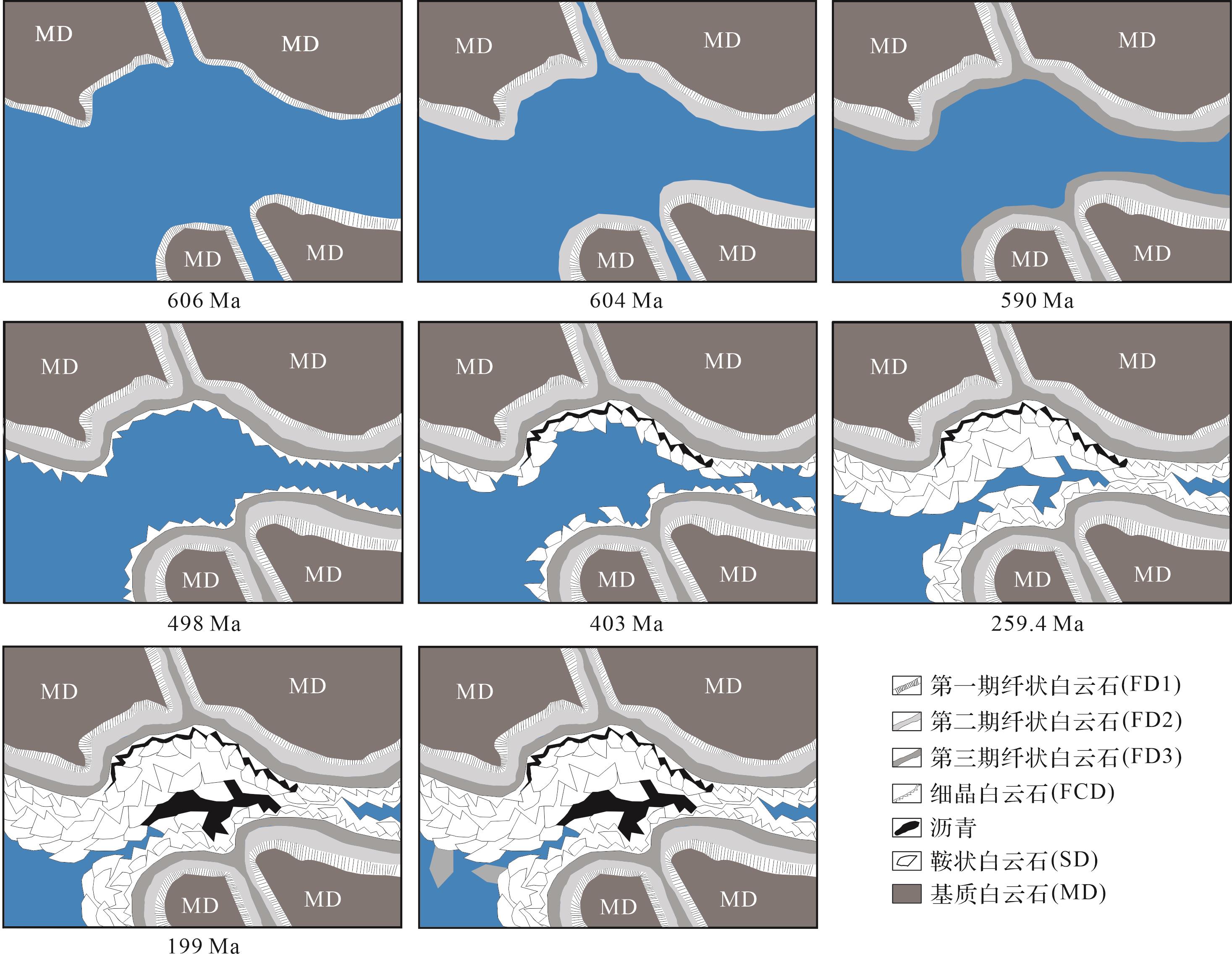 矿物占位关系和储层岩石学特征表明,灯二段、灯四段储层经历的成岩事件大体相似,但第一阶段成岩事件则具有不同的成储效应。以灯二段基质白云石的绝对年龄(607±26 Ma)为参考标准,结合成岩矿物定年结果(图7a),与前人研究获得的实验数据,可以清楚地区分灯二段、灯四段储层形成后的各个成岩事件。第一阶段成岩事件为多期纤状白云石胶结作用,作为储集空间中最早的胶结物,识别出的3期纤状白云石绝对年龄分别为606±21 Ma、604±42 Ma、590±15 Ma(图8),其形成时期略晚于灯二段或灯四段的表生成岩阶段。在阴极射线下(图3d),纤状白云石的暗淡发光特征表明流体类型偏氧化型,这一点也得到了中等—低Fe、Mn含量和稀土元素Ce负异常的印证(图5,6)。这些特征表明,纤状白云石极有可能形成于非埋藏成岩环境,流体来源为灯影组同期海水。岩心、薄片观察结果表明,3期纤状白云石在灯二段储层中均可观察到(图3),对先期形成的孔洞空间进行了明显的胶结破坏(图7b);但在灯四段储层,仅可以观察到第3期纤状白云石(FD3),对孔洞空间的破坏作用明显较弱(图4)。宏观、微观岩石学特征均表明灯二段储层这一阶段成岩事件对于储层物性的破坏性明显强于灯四段储层(图7b)。第二阶段成岩事件对应细晶白云石对于灯二段、灯四段储层的充填作用,其形成时间为498±12 Ma。在阴极射线下,细晶白云石的发光程度明显高于纤状白云石(图3d),同样具有Ce元素负异常,并且Fe、Mn富集程度与纤状白云石相近(图5,6),对应的流体类型可能是在地层条件下被微弱改造的海水[13]。