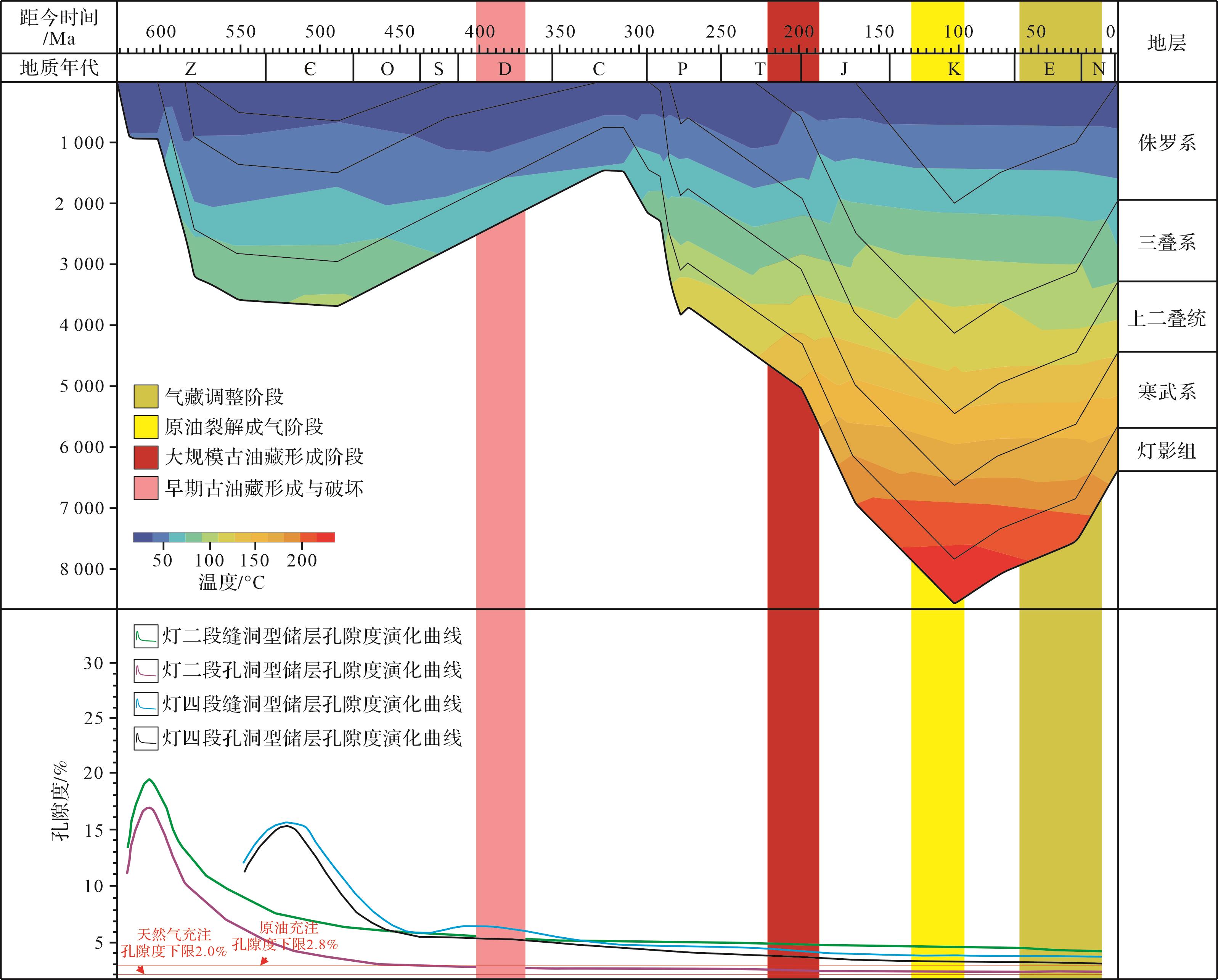 研究区灯影组在志留纪末期曾形成早期古油藏,由于海西早期发生抬升剥蚀而破坏[1],而后随着寒武系烃源岩的快速埋藏升温,大规模油气充注导致灯影组储层又经历了三个关键成藏阶段[13]。第一阶段为三叠纪末—侏罗纪初期的大规模古油藏形成阶段,第二阶段为白垩纪中期的大规模古油藏裂解成气阶段,第三阶段为古近纪—新近纪的气藏调整阶段[36⁃37]。原油的运移和聚集所对应的孔隙度下限比天然气更高,前人提出碳酸盐岩油藏古油藏形成的孔隙度下限为2.6%[22,38],若碳酸盐岩储层古孔隙度低于2.6%,则不利于古油藏运聚。古孔隙度恢复结果表明(图10)[1,3],灯二段缝洞型储层在大规模古油藏运聚时期的古孔隙度为4.84%,有利于古油藏运移聚集,原油裂解成气阶段的古孔隙度为4.24%,有利于气藏运移聚集,而后古孔隙度维持在4.24%,在气藏调整阶段仍有利于天然气聚集。灯二段孔洞型储层在大规模古油藏运聚时期的古孔隙度为2.18%,不利于大规模古油藏运移聚集,而后两个成藏阶段,古孔隙度维持在2.18%,有利于天然气的运移聚集。灯四段缝洞型储层在大规模古油藏运聚时期的古孔隙度为4.93%,有利于古油藏运移聚集,古油藏裂解成气阶段和气藏调整阶段时的古孔隙度分别为4.68%和3.58%,均有利于天然气运移聚集。灯四段孔洞型储层在大规模古油藏运聚时期的古孔隙度为3.05%,高于原油运移聚集的孔隙度下限,古油藏裂解成气阶段和气藏调整阶段时的古孔隙度维持在2.92%,有利于天然气运移聚集。